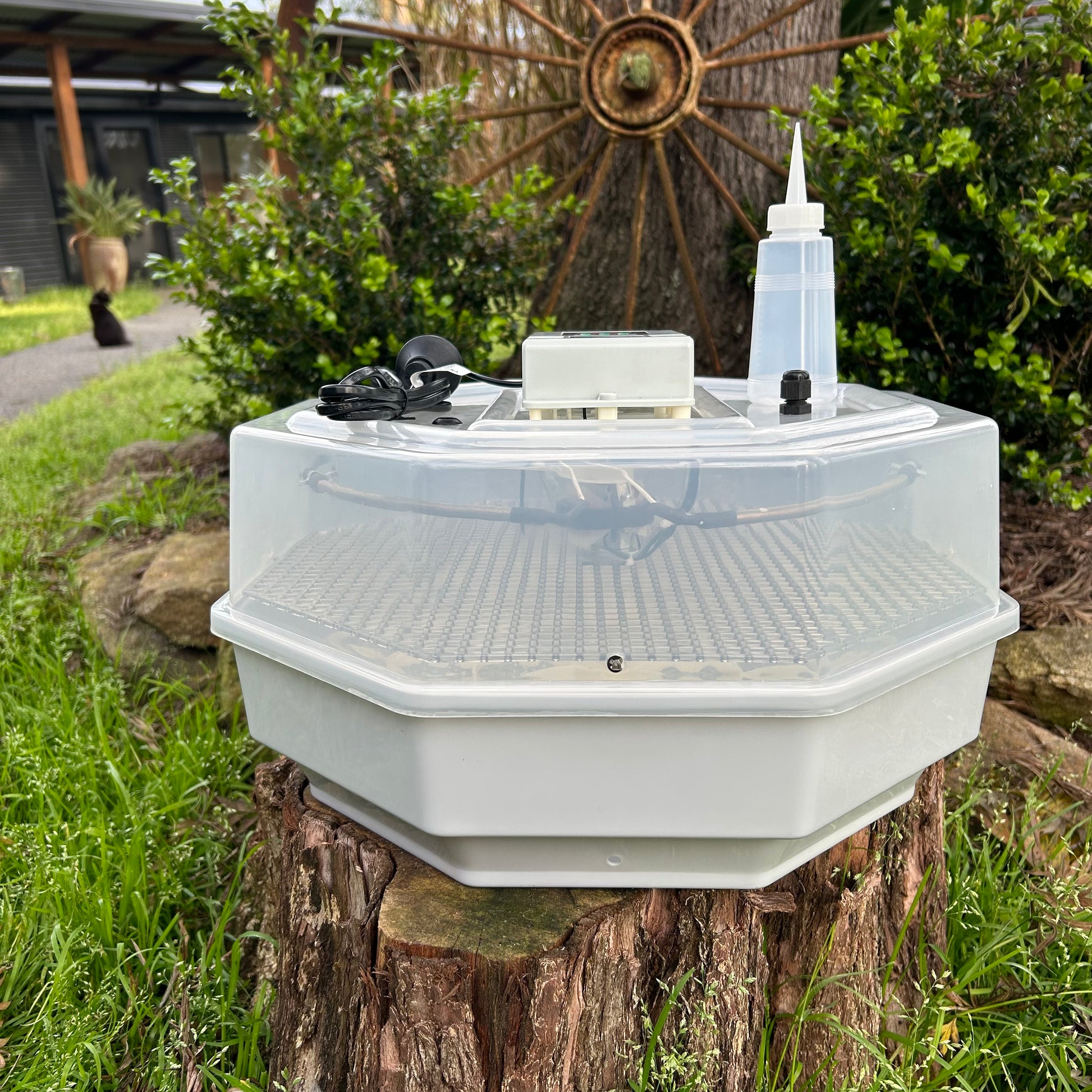 Eggs are rolled automatically. Humidity can be controlled via the supplied bottle.