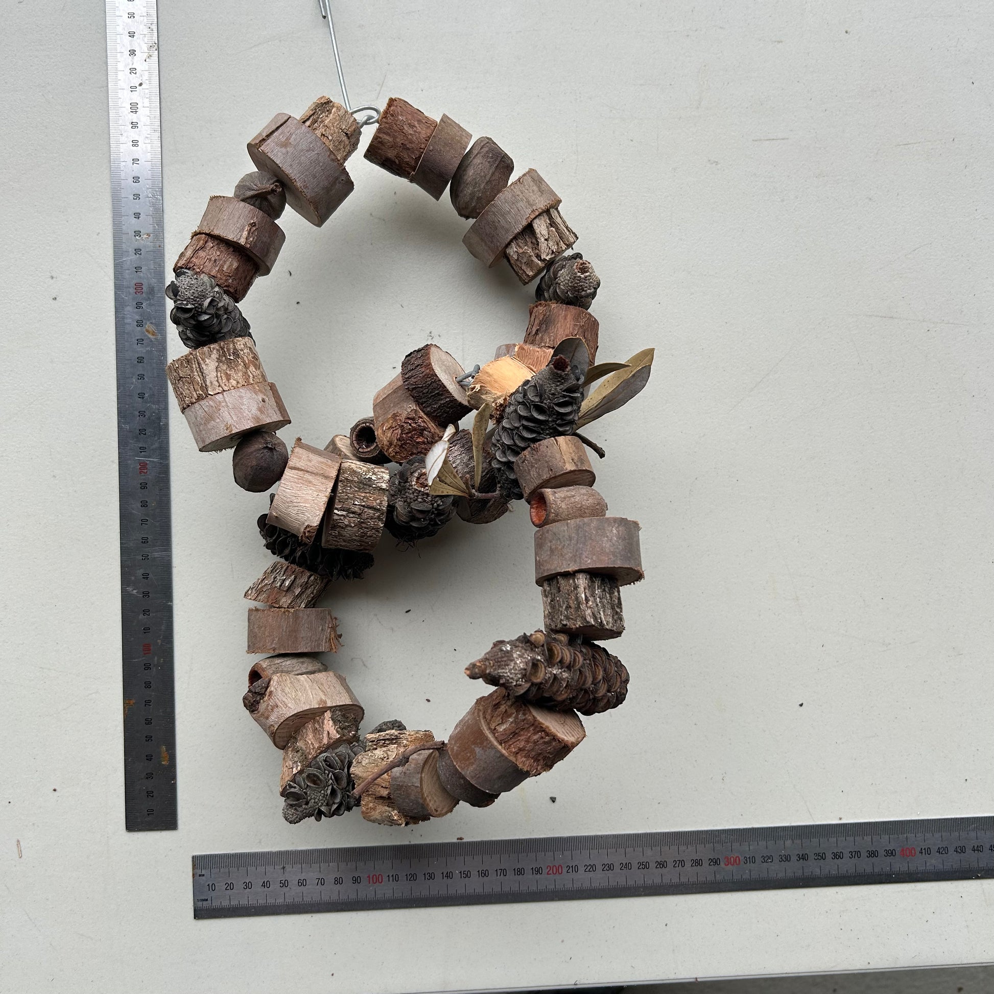 Natural wood blocks and pine cones that will allow your bird to forage, climb or swing from this toy.