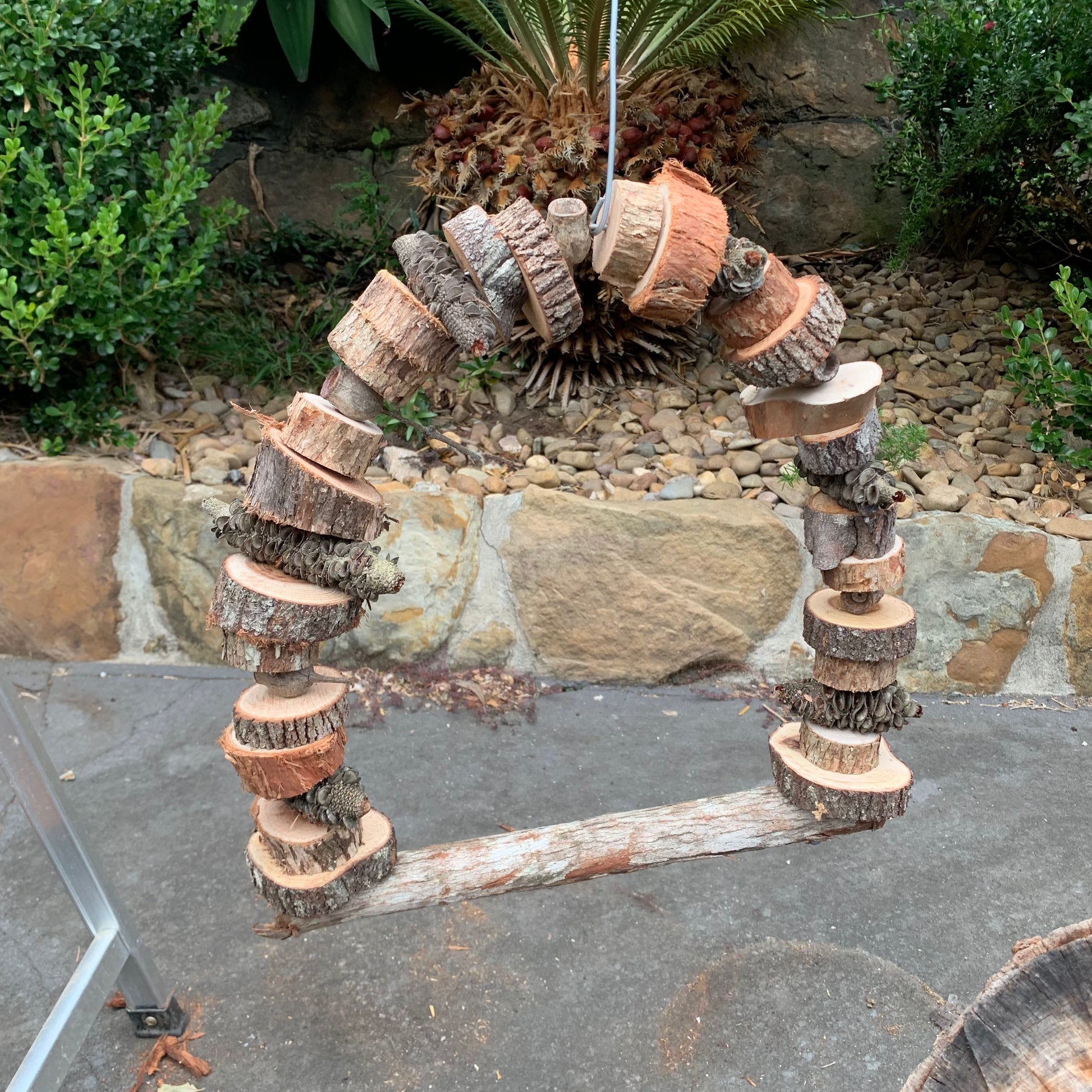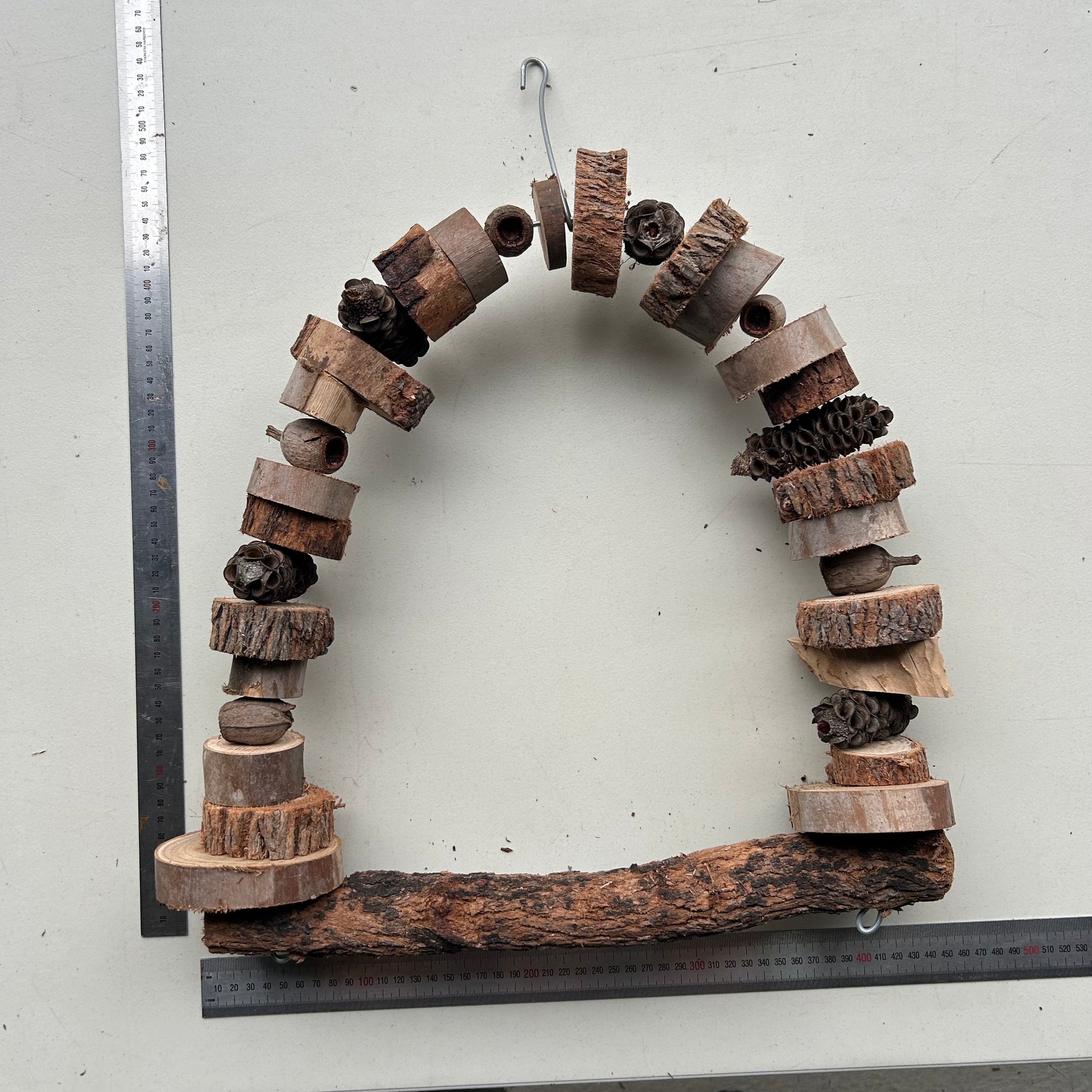 Natural wood blocks and pine cones for foraging and a perch for your bird to relax or swing on.