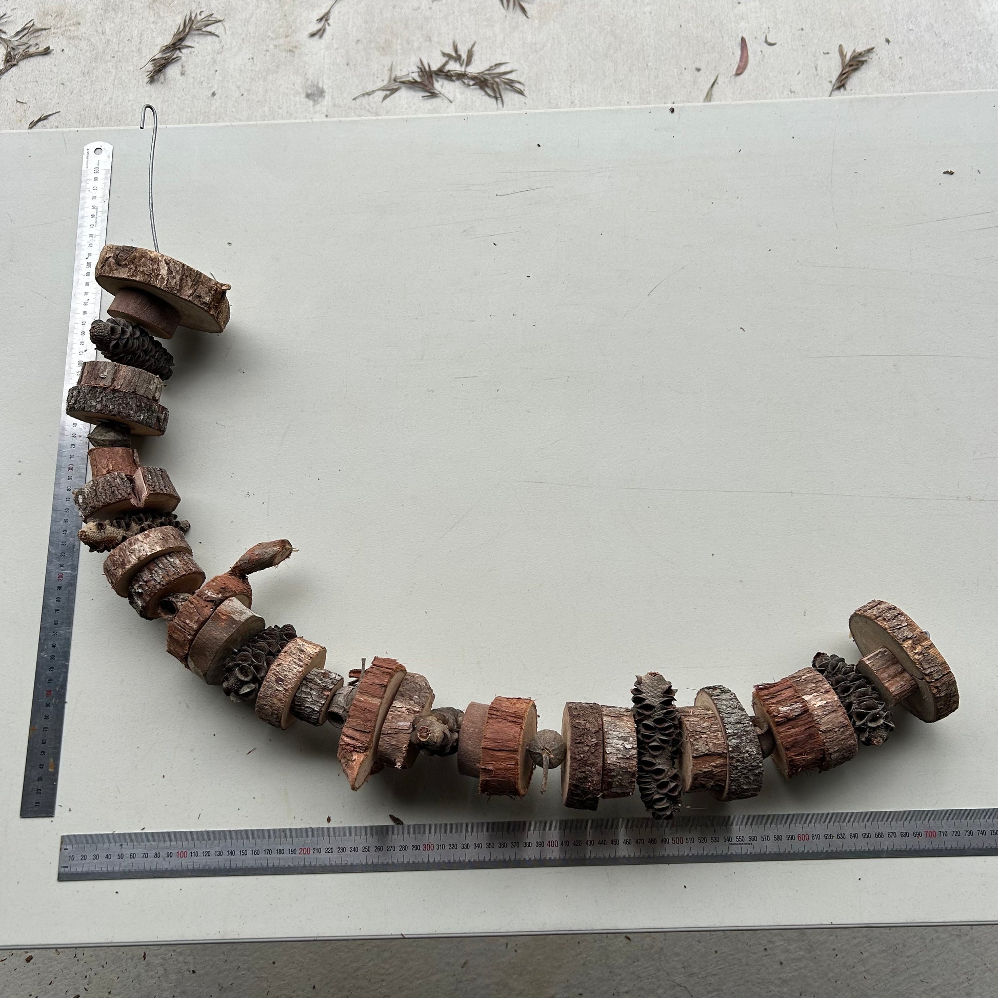 Natural wood blocks and pine cones for foraging. Thick wire allows the toy to be bent into different shapes. Your bird will be able climb or swing from this toy