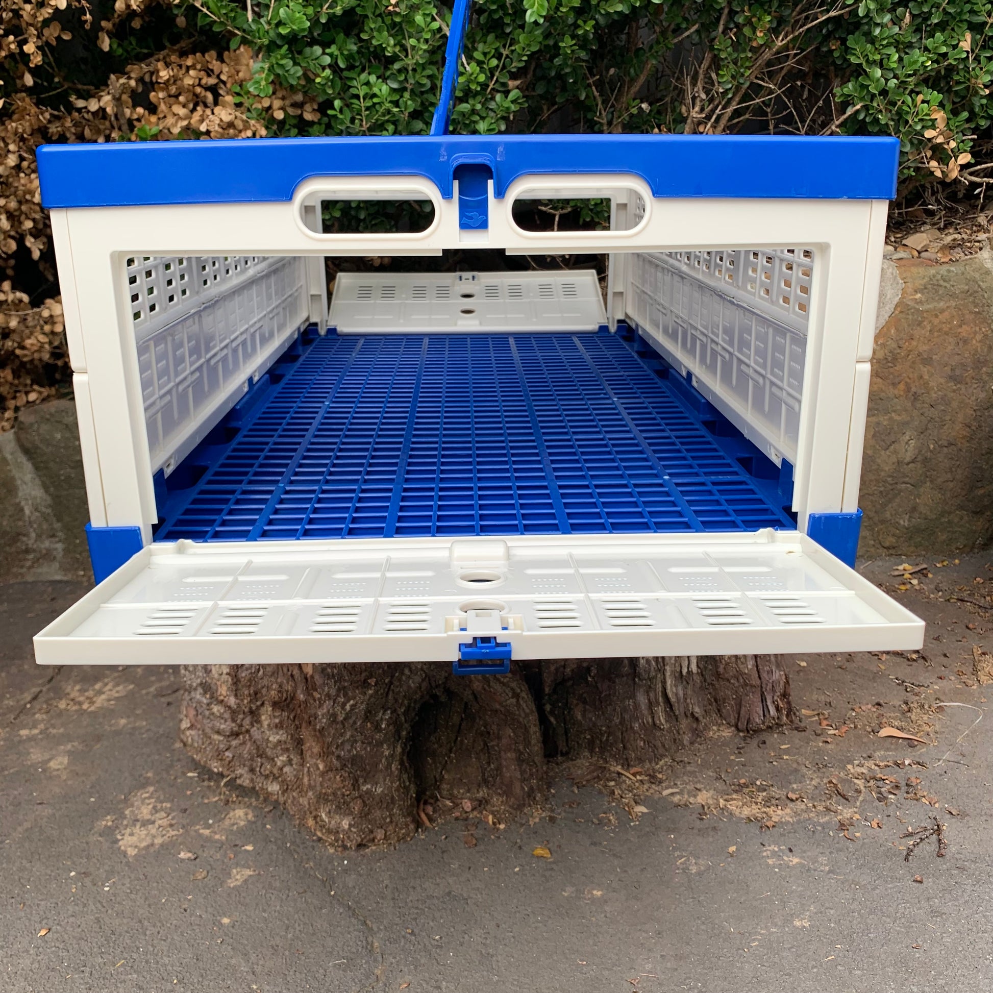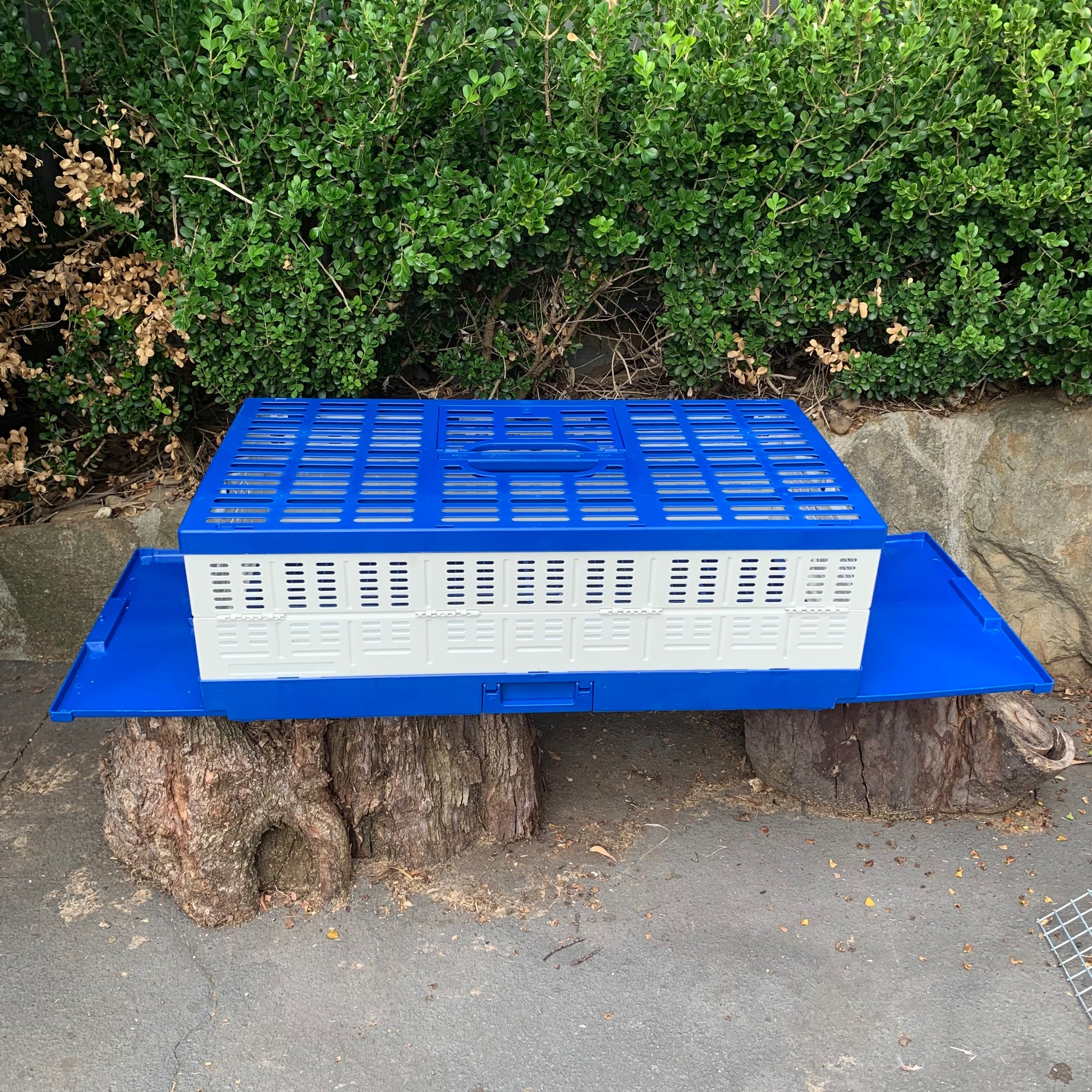 Designed to be airy, easy to clean, space saving and comfortable for you and your birds. UV stabilised plastic with collapsible sides. Handles in top and sides. Stuffing door in top and two release doors in ends. Plastic floor grate with removable plastic bottom trays for easy cleaning.