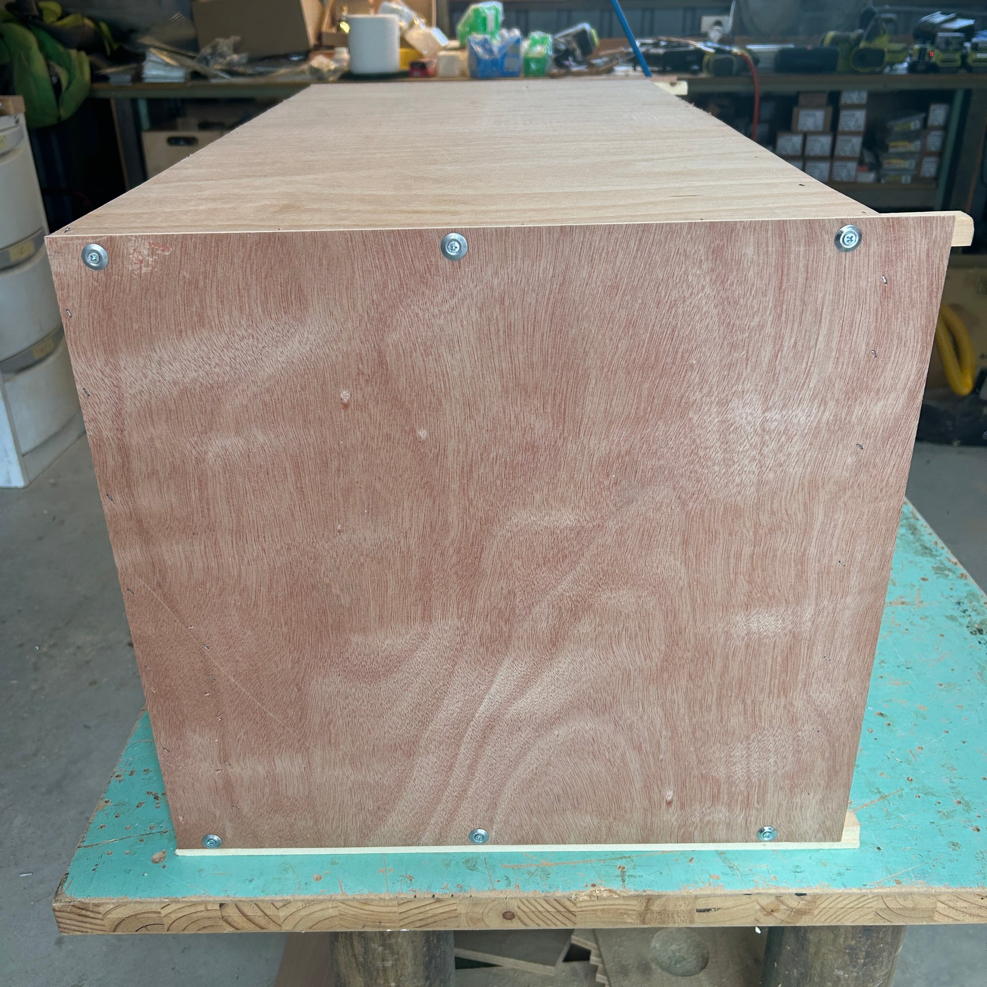 Assembly: turn the dowelled front upside down and attach both sides with the small lip against the front. Upside-down assembly ensures that the sides attach flush to the top of the front. Turn over and insert the floor and divider. Attach the back by securing the sides to the back panel. Attach the top and insert the tray.